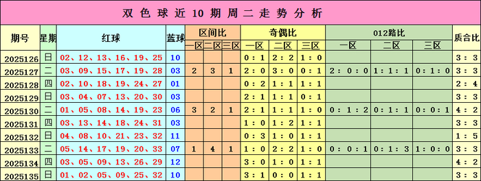 红三区(23-33):上期该区开出2个25、32,上周二该区开出1个33,最近10期该区开出15个奖号,最近10期星期二该区出现3奖号,近10期断区0次,近10期星期二断区0次,本期醒目该区落号,放置断档。最近10期该区奇偶比为8:7,其中星期二差别开特殊偶比为0:1、1:0、1:0,奇数号码相对热出。最近10期星期二该区号码012路比为1:1:1,本期该区要点温煦2码:29、33。