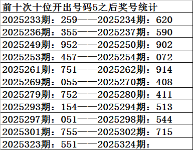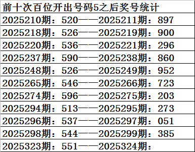 二、百位分析:上期开出号码5,前10次号码5出现之后下期诀别开出号码:8928972203,其中号码大小比为5:5,相等;奇偶比为4:6,基本相等;012路比为4:1:5,2路号码施展绝顶热。本期参考号码:5。
