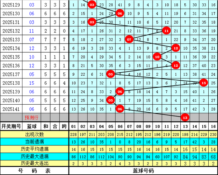 蓝球:上期蓝球号码为06,开出小 号、偶数,蓝球最近7期大小比为3:4,本期防备大号蓝球出现,蓝球存眷13。
