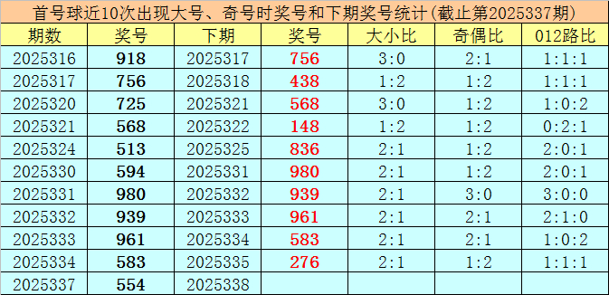 在首号球前10次开出大号、奇号类型之后,其下期分散开出奖号:756、438、568、148、836、980、939、961、583、276,其中号码奇偶比为7:3,大小比为7:3,012路比为3:3:4。