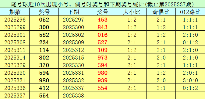 在尾号球前10次开出小 号、偶号类型之后,其下期分散开出奖号:453、843、016、527、109、973、594、980、939、554,其中号码012路比为7:3:0,奇偶比为6:4,大小比为4:6。