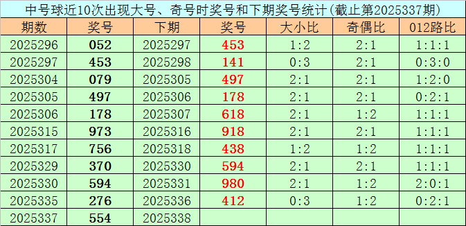 在中号球前10次开出大号、奇号类型之后,其下期分散开出奖号:453、141、497、178、618、918、438、594、980、412,其中号码012路比为3:5:2,奇偶比为8:2,大小比为5:5。